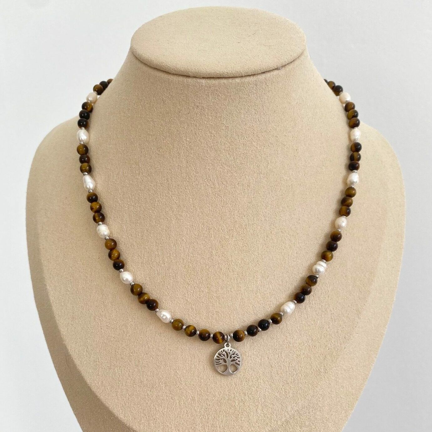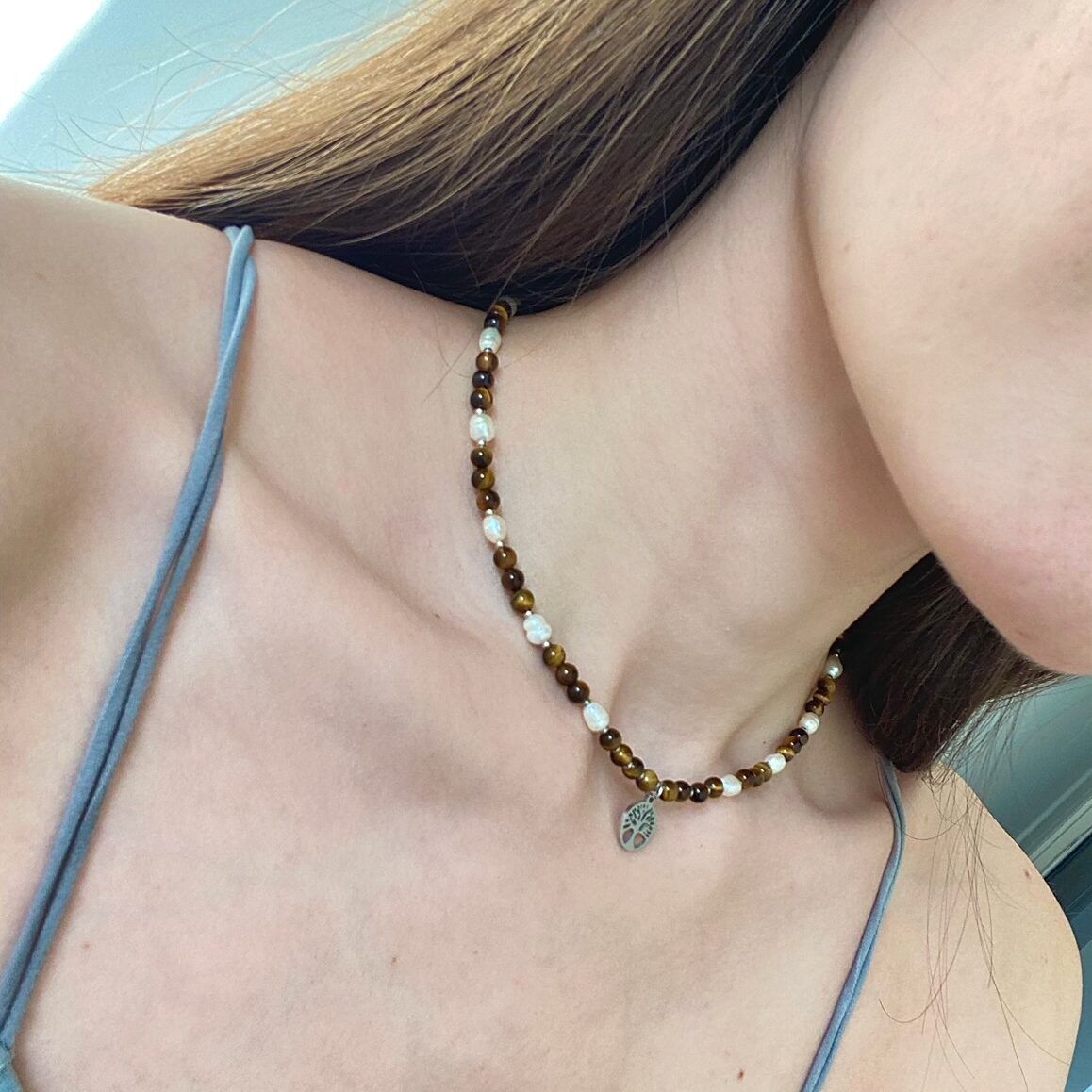 Matière : Pierres naturelles, perles d’eau douce et acier inoxydable.
