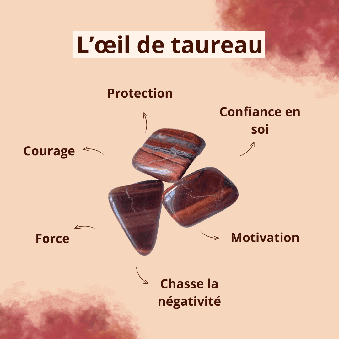 L’œil de taureau, tout comme l’œil de tigre, est une pierre de protection. Il éloigne de vous la négativité des autres et les énergies difficiles à supporter. Il agit comme un miroir, il renverra aux personnes néfastes leurs vibrations négatives et leurs propres critiques.